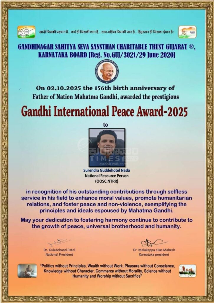 ಕುಂದಾಪುರ:ಸುರೇಂದ್ರ ಗುಡ್ಡೆಹೋಟೆಲ್ ಅವರಿಗೆ ಗಾಂಧಿ ಅಂತಾರಾಷ್ಟ್ರೀಯ ಪೀಸ್ ಅವಾರ್ಡ್ -2025.
