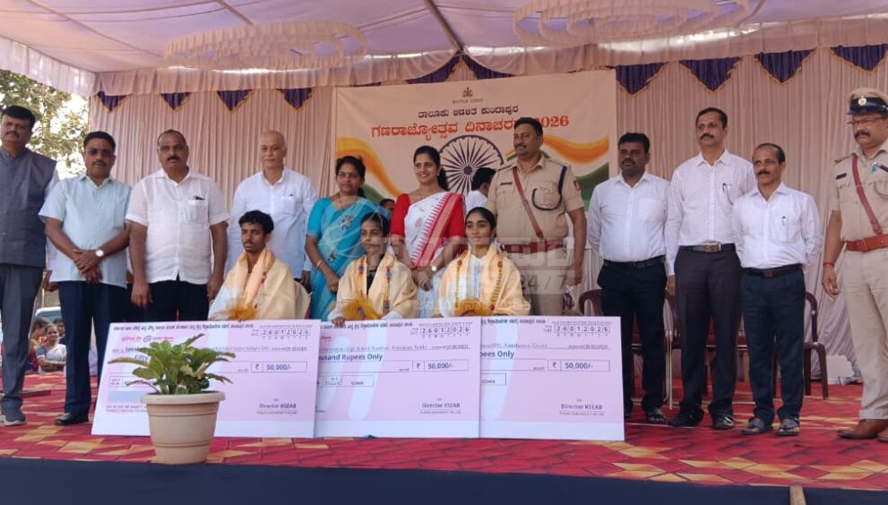 ಕುಂದಾಪುರ:2025 ನೇ ಸಾಲಿನ ಎಸ್ಎಸ್ಎಲ್ಸಿ ಪರೀಕ್ಷೆಯಲ್ಲಿ ತಾಲೂಕು ಮಟ್ಟದಲ್ಲಿ ಅತಿ ಹೆಚ್ಚು ಅಂಕ ಹಾಗೂ ರಾಜ್ಯ ಮಟ್ಟದಲ್ಲಿ 7ನೇ ರ್ಯಾಂಕ್ ಗಳಿಸಿರುವ ಹೊಸಾಡು ಗ್ರಾಮದ ನಿವಾಸಿ ಸವಿತಾ ಸುಕುಮಾರ ಸುವರ್ಣ ಅವರ ಪುತ್ರಿ ಕುಂದಾಪುರ ಸರಕಾರಿ ಪದವಿ ಪೂರ್ವ ಕಾಲೇಜಿನ (ಬೋರ್ಡ್ ಹೈಸ್ಕೂಲ್) ವಿದ್ಯಾರ್ಥಿನಿ ವೈಷ್ಣವಿ ಎಸ್.ಎಚ್ ಅವರಿಗೆ ಕುಂದಾಪುರ ಗಾಂಧಿ ಮೈದಾನದಲ್ಲಿ ಸೋಮವಾರ ನಡೆದ ಗಣರಾಜ್ಯೋತ್ಸವ ಕಾರ್ಯಕ್ರಮದಲ್ಲಿ ತಾಲೂಕು ಆಡಳಿತ ಪರವಾಗಿ ಅಭಿನಂದಿಸಿ.50 ಸಾವಿರ ರೂಪಾಯಿ ಮೌಲ್ಯದ ಚೆಕ್ ವಿತರಿಸಲಾಯಿತು.ಕುಂದಾಪುರ ಶಾಸಕ ಕಿರಣ್ ಕುಮಾರ್ ಕೊಡ್ಗಿ,ಕುಂದಾಪುರ ಉಪವಿಭಾಗಾಧಿಕಾರಿ ರಶ್ಮಿ ಎಸ್.ಆರ್,ತಹಶೀಲ್ದಾರ್ ಪ್ರದೀಪ್ ಕುರುಡೇಕರ್,ಡಿವೈಎಸ್ಪಿ ಹೆಚ್.ಡಿ ಕುಲಕರ್ಣಿ,ಕುಂದಾಪುರ ಕ್ಷೇತ್ರ ಶಿಕ್ಷಣಾಧಿಕಾರಿ ಶೋಭಾ ಶೆಟ್ಟಿ ಮತ್ತು ಹಿರಿಯ ಅಧಿಕಾರಿಗಳು ಉಪಸ್ಥಿತರಿದ್ದರು.