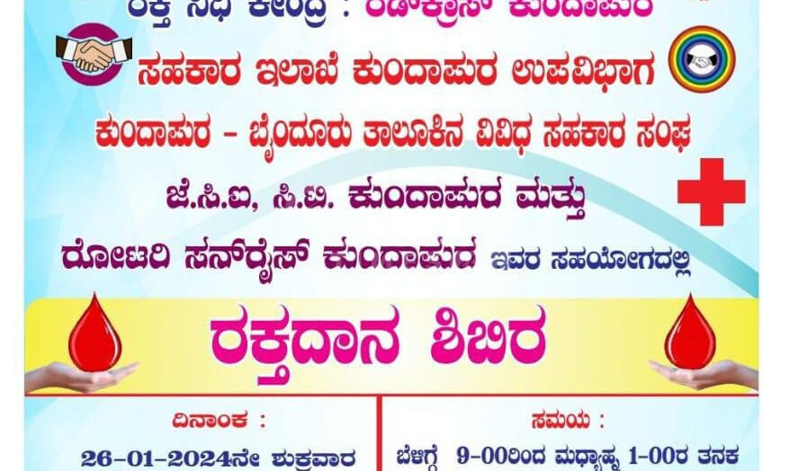 ಕುಂದಾಪುರ:ರಕ್ತ ನಿಧಿ ಕೇಂದ್ರ ರೆಡ್ಕ್ರಾಸ್,ಸಹಕಾರ ಇಲಾಖೆ ಕುಂದಾಪುರ ಉಪವಿಭಾಗ,ಕುಂದಾಪುರ – ಬೈಂದೂರು ತಾಲೂಕಿನ ವಿವಿಧ ಸಹಕಾರ ಸಂಘ,ಜೆ.ಸಿ.ಐ ಸಿ.ಟಿ ಕುಂದಾಪುರ ಮತ್ತು ರೋಟರಿ ಸನ್ರೈಸ್ ಕುಂದಾಪುರ ಅವರ ಸಹಯೋಗದಲ್ಲಿ ಬೃಹತ್ ರಕ್ತದಾನ ಶಿಬಿರ ಜ.26 ರಂದು ಶುಕ್ರವಾರ ಬೆಳಿಗ್ಗೆ 9 ರಿಂದ 1 ರ ತನಕ ಶ್ರೀಲಕ್ಷ್ಮೀ ನರಸಿಂಹ ಕಲಾಮಂದಿರ ಜೂನಿಯರ್ ಕಾಲೇಜು ಕುಂದಾಪುರದಲ್ಲಿ ನಡೆಯಲಿದೆ ಎಂದು ಮಹಿಳಾ ವಿವಿಧೋದ್ದೇಶ ಸಹಕಾರ ಸಂಘ ಗಂಗೊಳ್ಳಿ ತಿಳಿಸಿದೆ.ಸಂಘದ ಸದಸ್ಯರು ಹೆಚ್ಚಿನ ಸಂಖ್ಯೆಯಲ್ಲಿ ಭಾಗವಹಿಸಬೇಕೆಂದು ವಿನಂತಿಸಿಕೊಂಡಿದೆ.